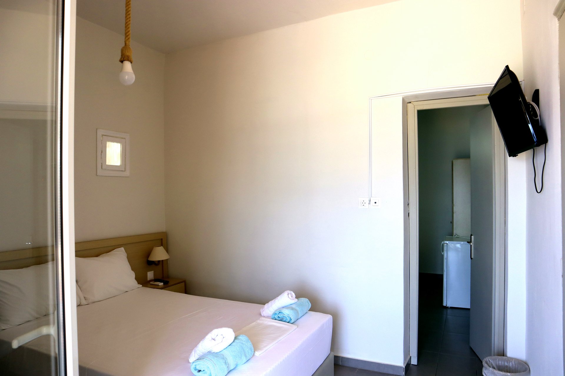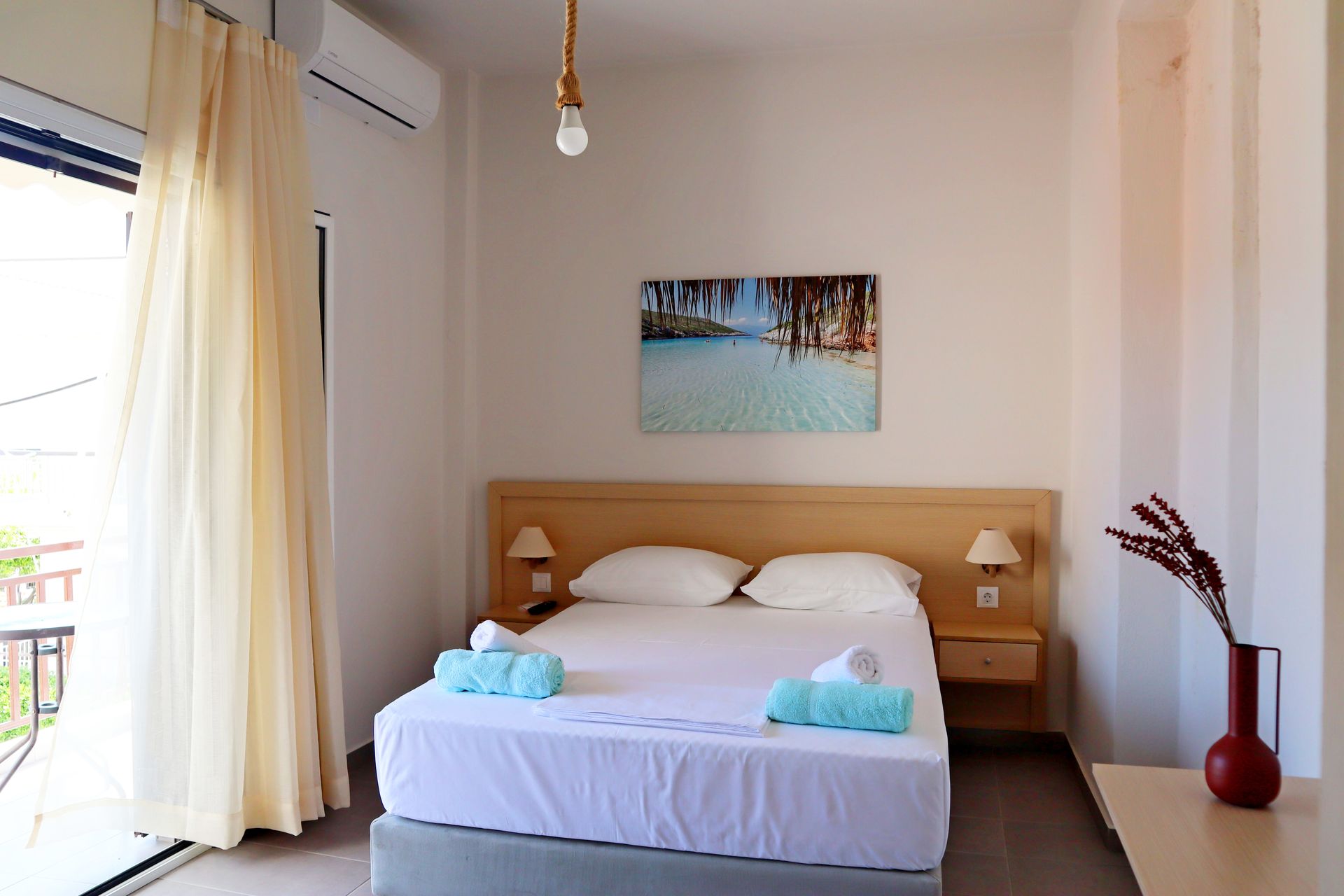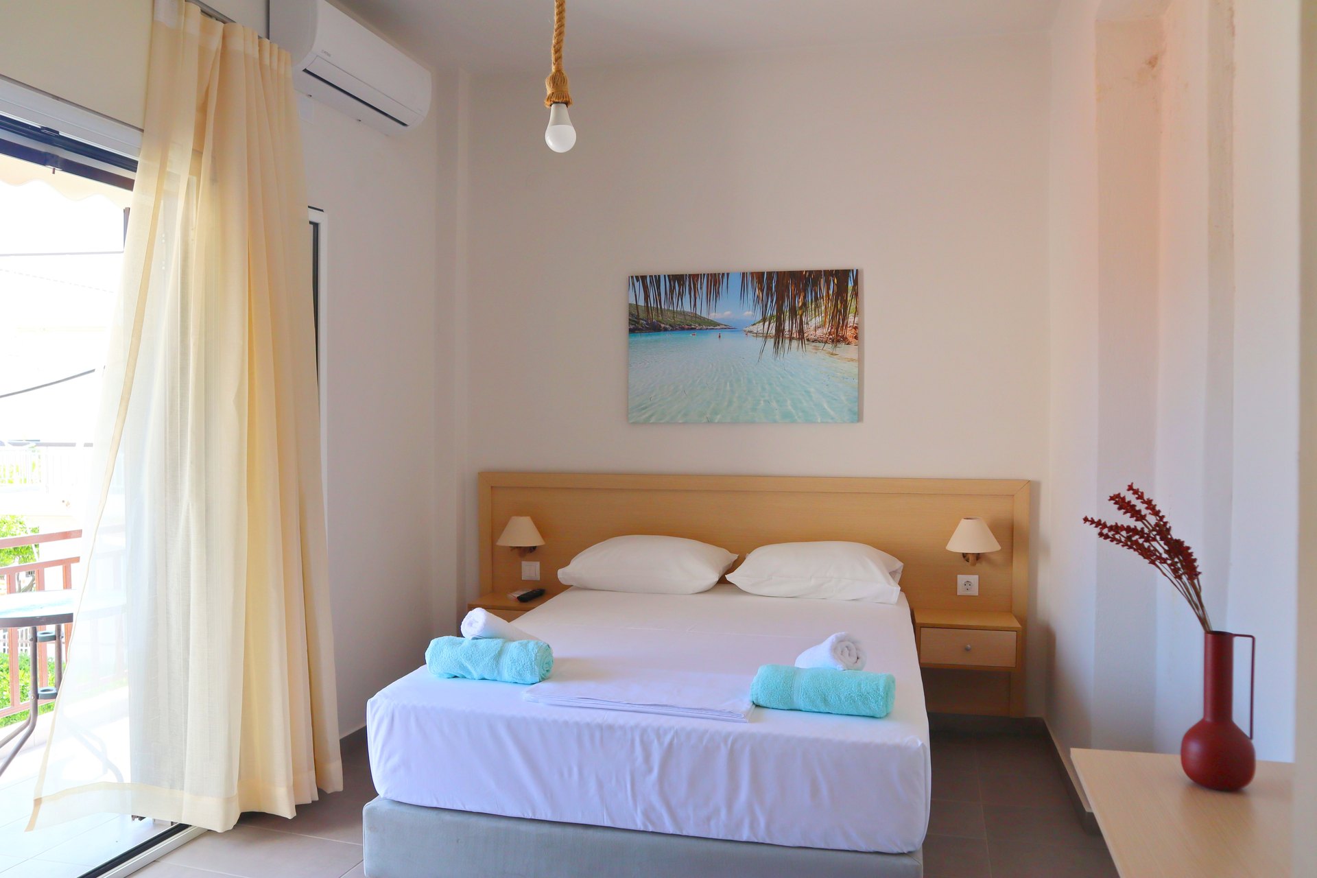 Φωτεινό δίκλινο δωμάτιο με ένα διπλό κρεβάτι. Θέα στον Ευβοϊκό κόλπο και την αμμώδη παραλία από το επιπλωμένο μπαλκόνι που διαθέτει τέντα και τραπεζάκι με καρέκλες. Περιλαμβάνεται πρωινό.